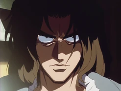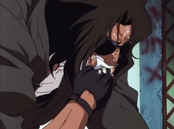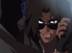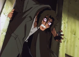 Spike Spiegel and Jet Black eventually hunted him on Tijuana. Solensan "met" Spike in a bathroom while coming down from his Bloody Eye episode, then followed him discretely, suspecting a trap, while Spike talked to his wife. While they talked, he attacked Spike from behind and drove off with Katerina. On his next attempt to sell Bloody Eye, he realized Spike set a trap for him and attacked him, however, without the full benefit of Bloody Eye, Spike was able to best him. Under interference from an attack by a rival syndicate, he escaped with Katerina and he decided to charge the ISSP barricade of the Astral Gate to escape.