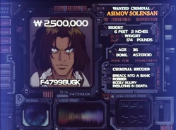 Asimov Solensan (アシモフ・ソーレンサン?) was a high-level member of a crime syndicate and bounty head. He was killed by his wife, Katerina while attempting to escape from Spike Spiegel, as he had a bounty of 2.5 million ₩.