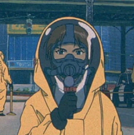 In October 2071, Riley reported on a tanker explosion in Alba City. With a biohazard suit on, she informed Mark Rather of the situation.[1]