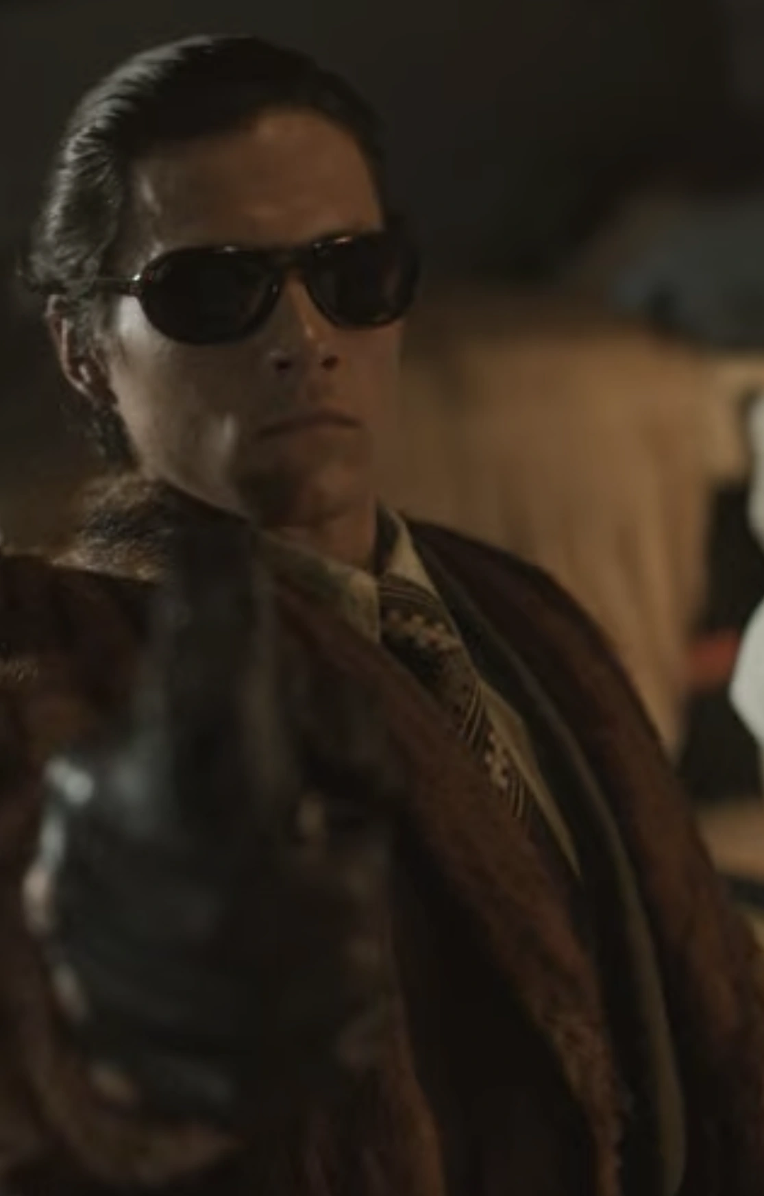 Dimitri had dark brown hair. He wore a brown jacket over a suit and sunglasses.