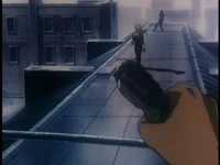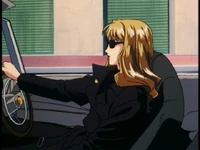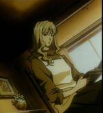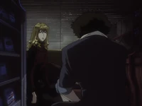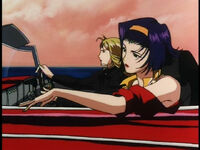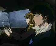 In 2071, Julia, living in Tharsis, was tipped off by Shin that the syndicate was coming after her. The Van wanted to eliminate any connections to Vicious. She was soon pursued by syndicate men by car and headed for the airport. By chance, she drove by Faye Valentine there. Faye decided to shoot at her pursuers and was able to cause them to crash. Julia had her enter the car while they lay low off the highway. Julia eventually recognized Faye as an acquaintance of Spike's and asked her subtly where she could find bounty hunters, without mentioning his name. Faye didn't understand until Julia dropped her off and revealed who she was by asking her to tell Spike she'll be "at the place."[3]