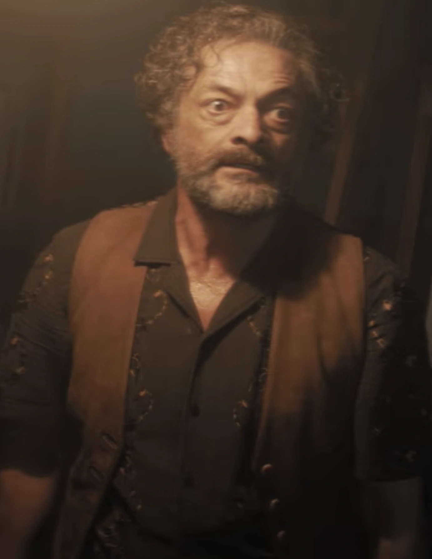 Shahab had black hair with tints of gray, a matching color full beard, and brown eyes. He wore a brown tunic over a dark-colored dress shirt and brown pants.